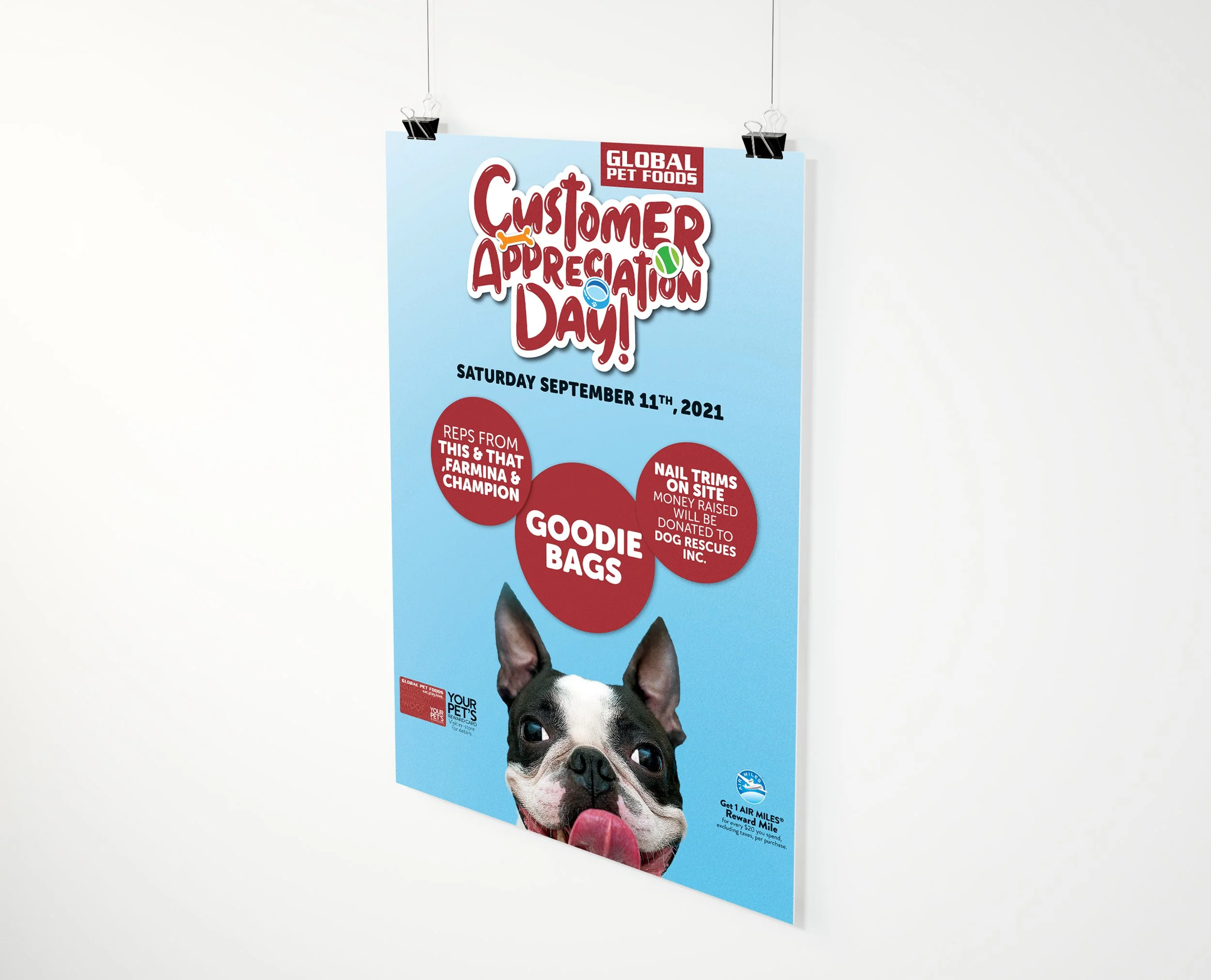 On a yearly basis, Global Pet Foods stores run in-store events such as Customer Appreciation Days, We Are Moving Campaigns, New Store Opening Event, Friends & Family Day Event & More. As the graphic designer I designed various in-store P.O.P to implement around the store to advertise the event details.